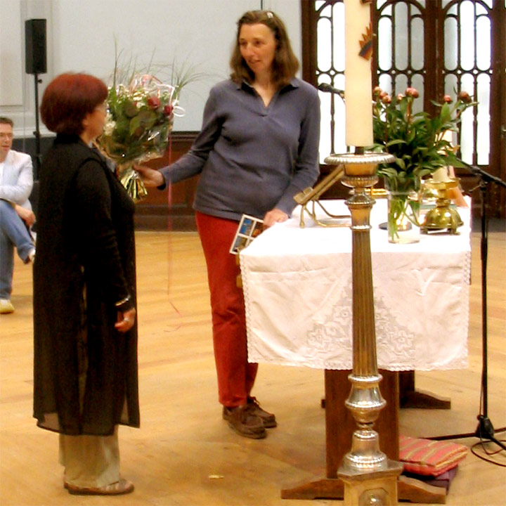 Afscheid Flora. Na de viering hebben we met een speech door Angela afscheid genomen van Flora Umarova. Volgende week is Irina weer terug uit Rusland. We hopen echter Flora bij gelegenheid weer terug te zien in De Duif. We zeggen het met bloemen ...